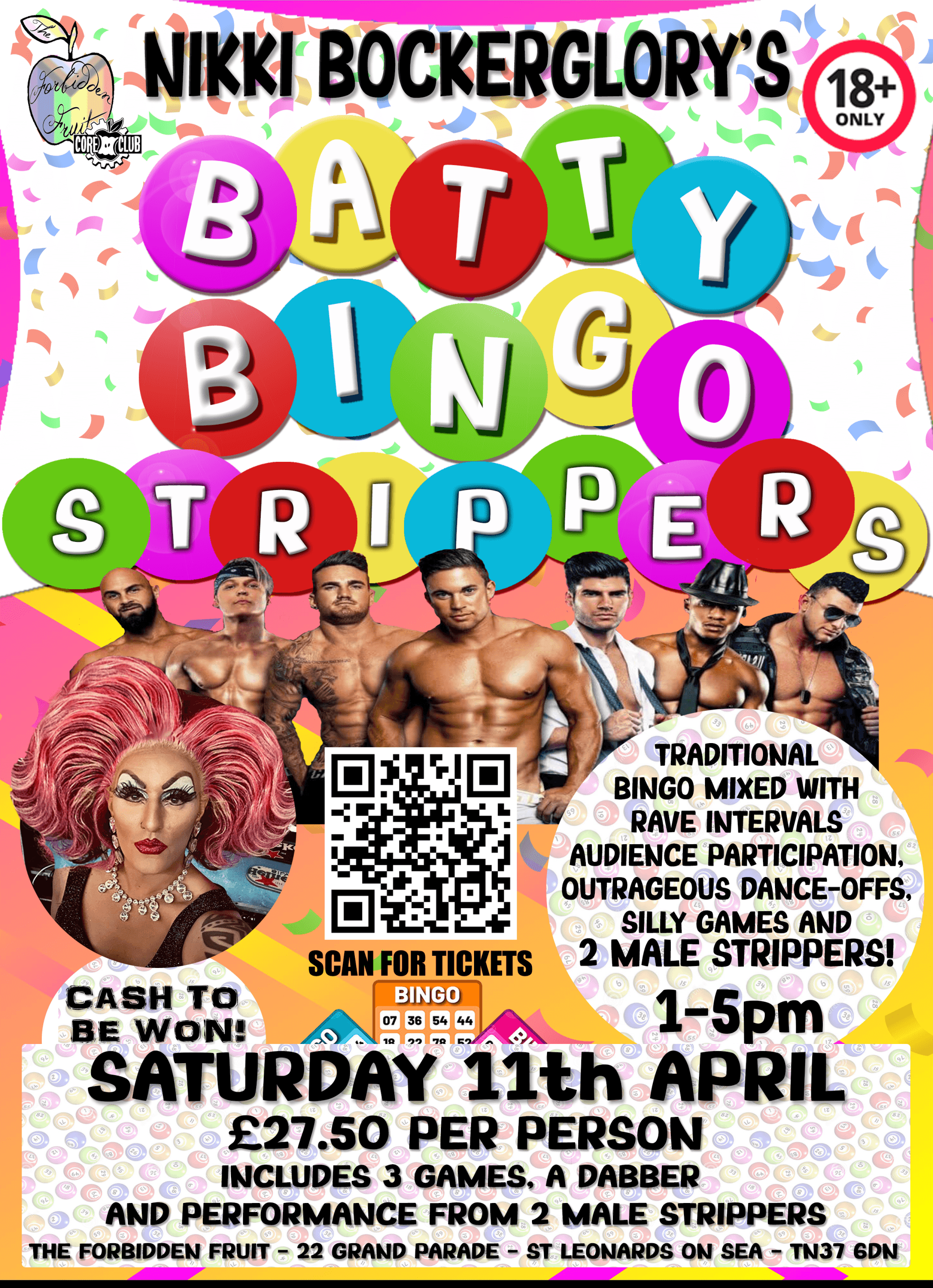 Just when you thought The Forbidden Fruit’s Batty Bingo events couldn’t get any better along comes the stripper edition! 2 hot male strippers will perform during the chaotic blend of traditional bingo and organized madness! Think traditional bingo…but with a raved-up twist of singalongs, silly games, ridiculous prizes, enough confetti to bury a small elephant and 2 MALE STRIPPERS!